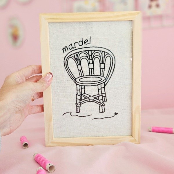 Cuadro bordado a máquina silla Mar del Plata, sobre tela tusor color blanca con hilo negro.